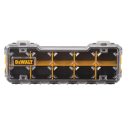 This DEWALT® 10-compartment organizer with removable dividers is optimal for hand tools and small parts, featuring a durable, polycarbonate lid and side latches that enable stacking to other PRO organizers. Removable dividers for inner customization.
