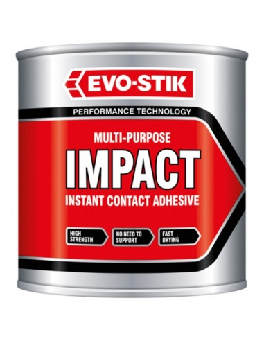 EVO-STIK Impact Adhesive Tin is a high strength, multipurpose adhesive that bonds on contact with no need for clamping or support. It has the power to bond most types of materials and will even fix non-porous surfaces together e.g. metal to metal, making it ideal for a wide range of DIY tasks and household repairs.
