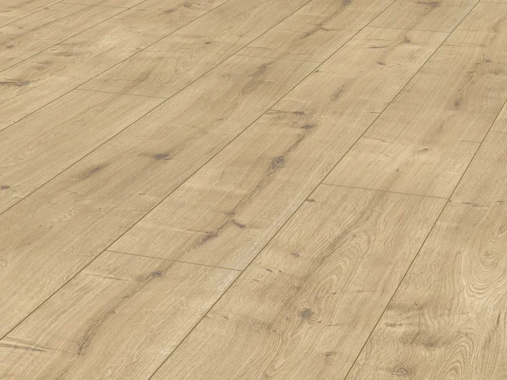 New Hampshire Oak is a beautiful 12mm laminate. It has a v-groove on all four sides, which gives it that realistic wood floor appearance. The integrated click-fit system allows for easy installation. The AC4 rating makes this floor suitable for heavy domestic and medium commercial use. New Hampshire Oak has a medium embossed surface which gives it an authentic textured finish. The oak decor has a light brown colour in a natural style.